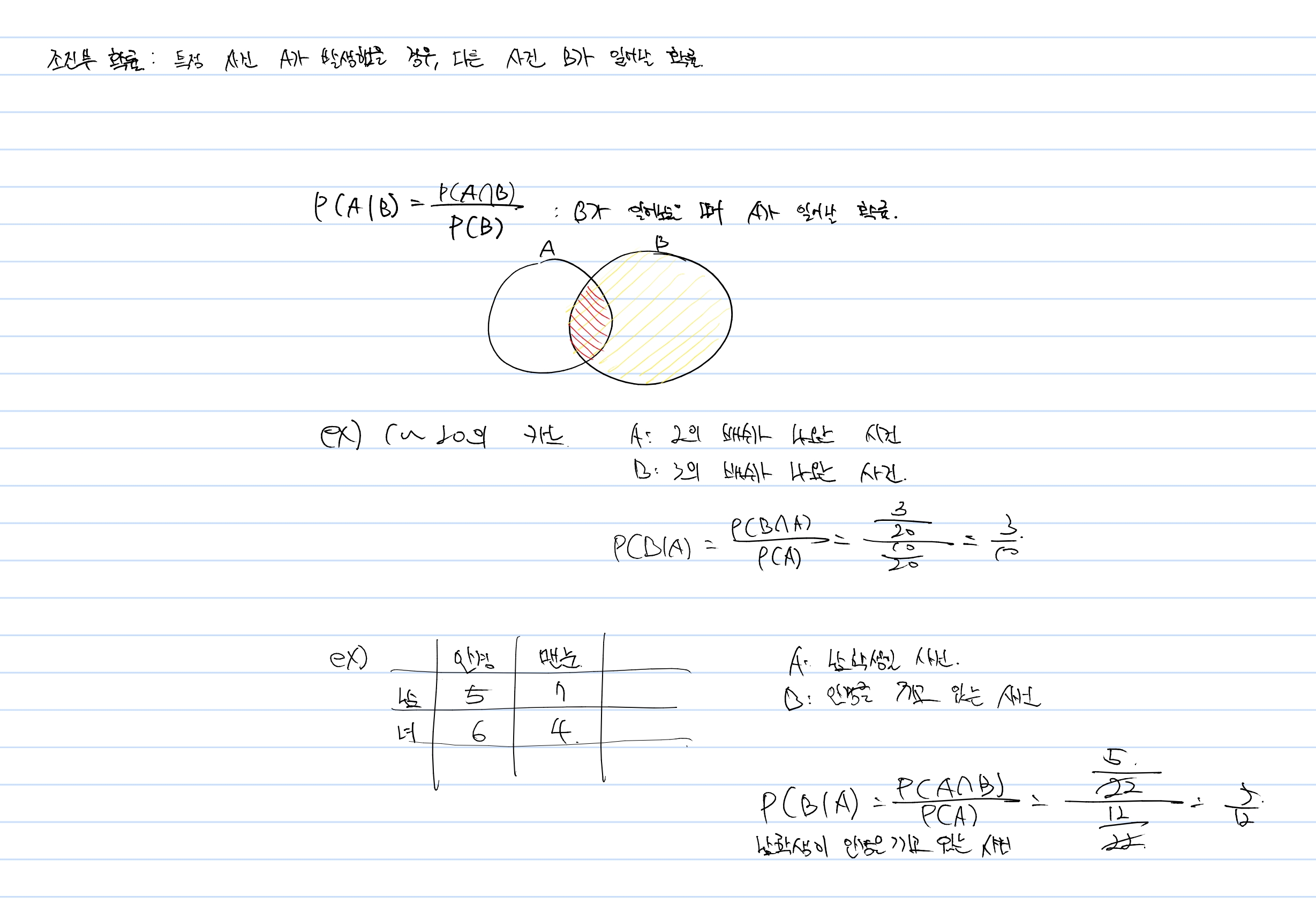 - 조건부 확률은 조건이 주어진 상황에서의 확률이다.